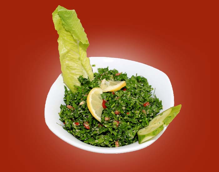 We have the famous Sudanese Peanut salad, a mixture of sliced tomatoes, cucumbers, arugula, peanut butter, lemon, and sesame oil. And try the Eggplant Salad. Enjoy the taste of Tabbouleh, a refreshing Lebanese salad made with parsley, tomatoes, onions, and lemon juice. Try Fattoush, Arabic salad, Yogurt Salad with Yogurt, and more.